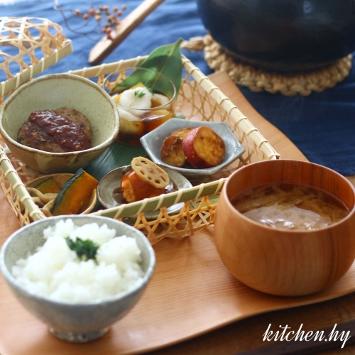 ・KOJIハンバーグ(メインは秋のお野菜ではないですが、みんな大好きハンバーグ。手間を大分省いて、なのにフワッフワにできるハンバーグ。お弁当や常備、冷凍にと活躍できます)