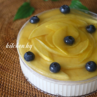 さっぱりだけど濃厚、そんな甘酒レアチーズケーキの上に桃のゼリーをのせて涼しげなひんやりおやつです。